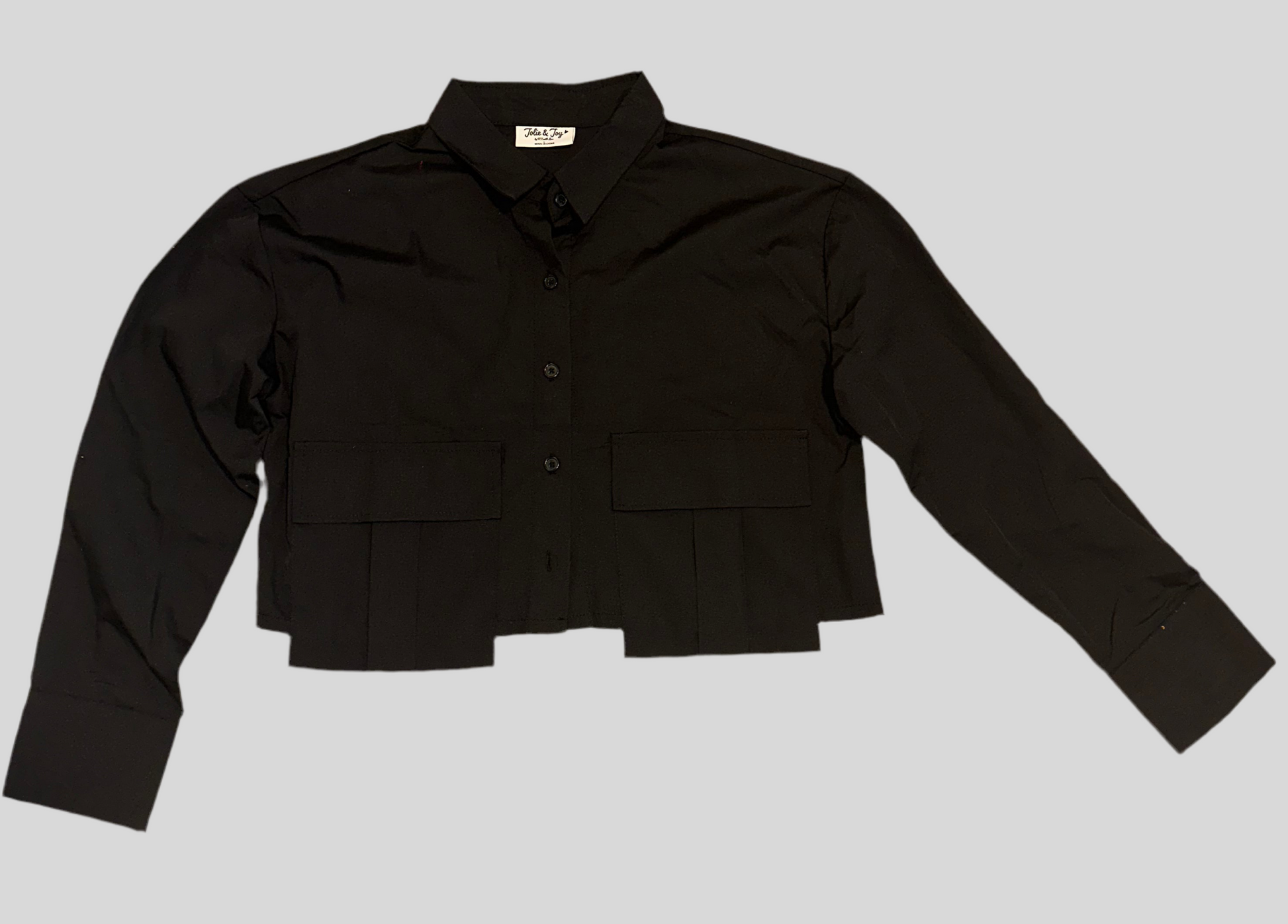 Eleva tu look con esta camisa cropped de corte estructurado en color negro, perfecta para un estilo urbano, elegante y con actitud. Su diseño corto y geométrico, con bolsillos frontales de solapa, añade un toque utilitario moderno. Ideal para combinar con pantalones de tiro alto, faldas o sobre prendas ajustadas para crear contrastes.